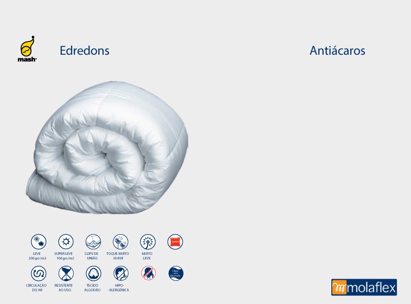 Enchimento: Fibra oca siliconada de Dacron® antiácaros, antibactérias e antifungos